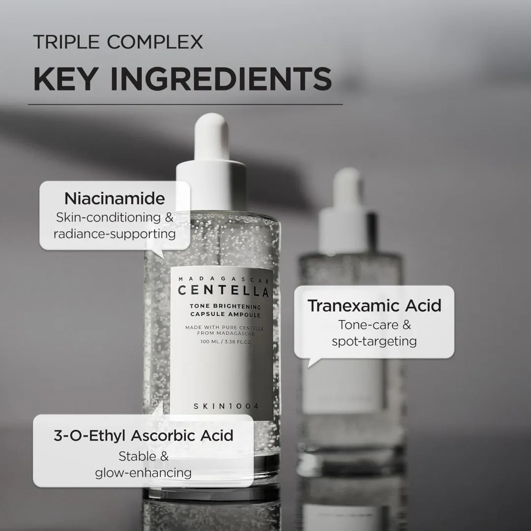 Essence-like textured ampoule with Madecassoside micro-beads that immediately melts on the skin, quickly absorbs with a soft and non-sticky finish. Patented ingredient with Madecassoside brightens the skin tone and gives the skin its natural glow. Madecassoside is rich in amino acids, beta carotene, fatty acids, and phytochemicals. High concentration of Madagascan Centella asiatica extract soothes and calms the skin. Tranexamic acid helps reduce melanin production and improve discoloration after acne breakouts and sun damage. Always provide prevention and pigmentation of care. Niacinamide brightens the skin tone as well as restores and repairs the skin barrier.