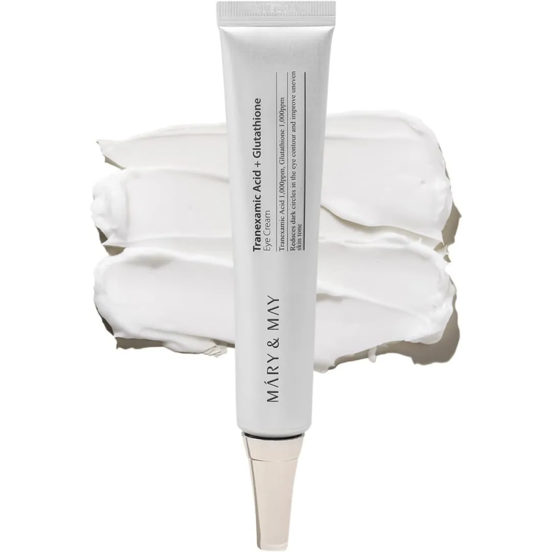 Mary & May Tranexamic Acid + Glutathione Eye Cream, a targeted solution for dark circles, fine lines, and wrinkles. Clinically proven to improve skin texture, dark circles, and fine lines within just two weeks, this eye cream combines the brightening power of Tranexamic Acid which inhibits melanin production and reduces pigmentation with Glutathione, Niacinamide, and Vitamin C to deliver a luminous, even-toned look.
