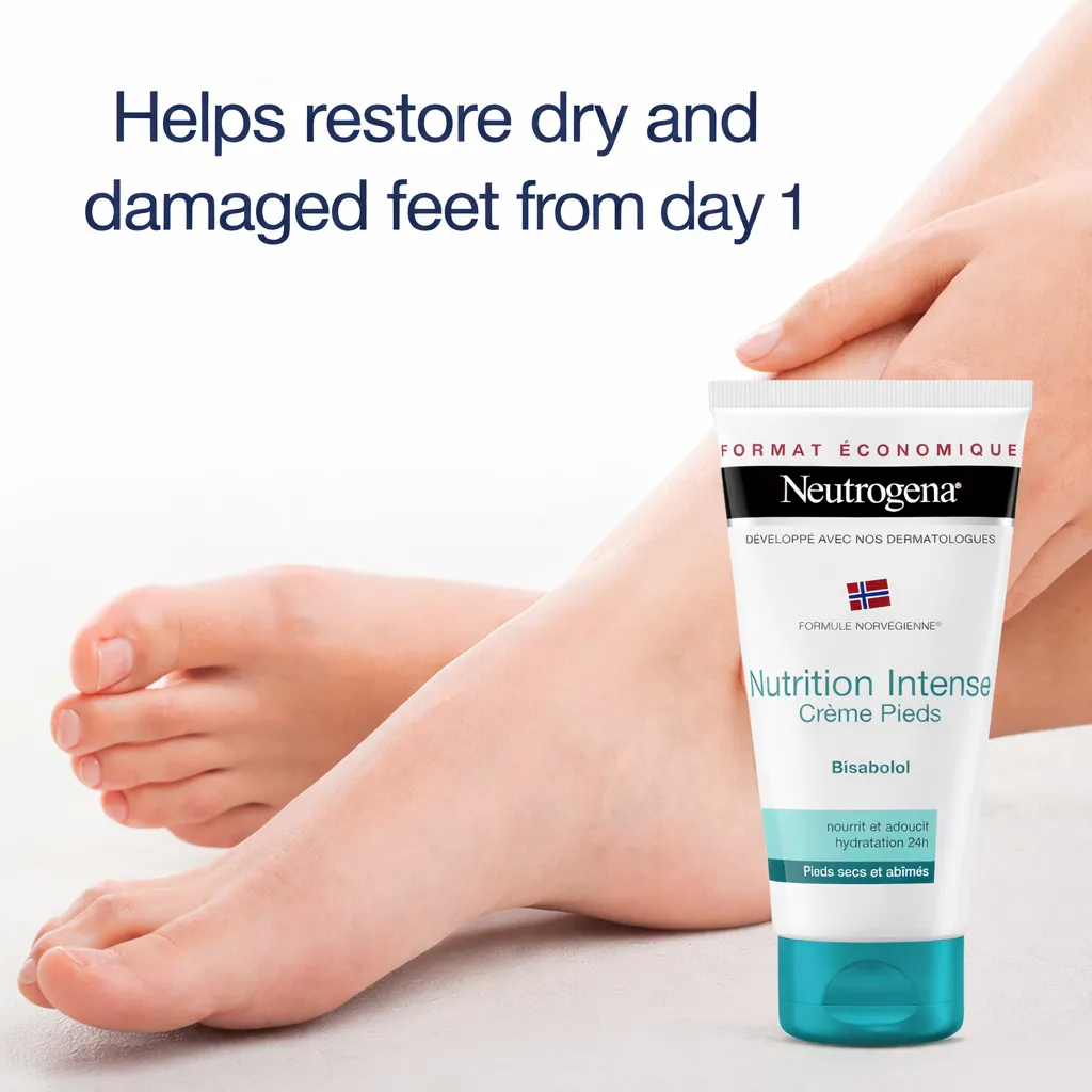 NEUTROGENA Intense Nutrition Dry & Damaged Feet Cream was developed by dermatologists. It is enriched with glycerin, a moisturizing, emollient, and protective agent. Glycerin compensates for the functions of the skin's natural lipids when they are deficient, which is the cause of dry feet. It also forms a barrier film on the epidermis, limiting moisture loss and maintaining a constant level of hydration: these surfactant properties help smooth the skin and improve its elasticity. By promoting lipid synthesis in the epidermis, glycerin plays a role in the skin repair process and provides lasting protection. This Neutrogena Dry & Damaged Feet Cream is part of the Norwegian Formula range, which uses exclusively glycerin from vegetable oils. It immediately soothes even very dry skin and helps repair it from day one. Thanks to its non-sticky texture, the cream is absorbed instantly. The skin on the feet is visibly softer and more supple.