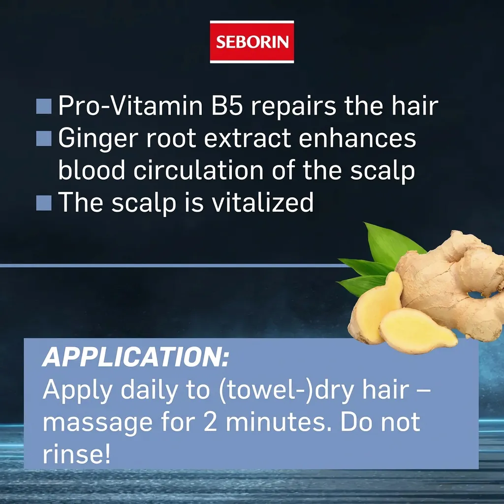 Schwarzkopf SEBORIN Hair Tonic regenerates hair from root to tip: The provitamin B5 contains penetrates the hair shaft and repairs damaged hair from within. Ginger root extract further enhances blood circulation in the scalp and revitalizes the hair roots – a revitalized scalp is the foundation for healthy-looking hair. Seborin Hair Tonic also helps prevent dandruff.
