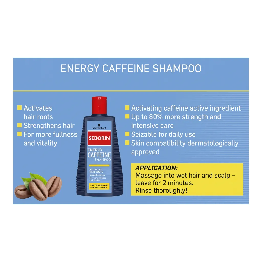 With Schwarzkopf SEBORIN Energy Caffeine Shampoo, the energy production of the hair roots in thinning hair can be increased. Thanks to the caffeine formula, hair roots are stimulated during washing, which can lead to the release of growth factors. Hair gains up to 80% more strength and is nourished. The shampoo also contains a vital complex and is suitable for daily use.