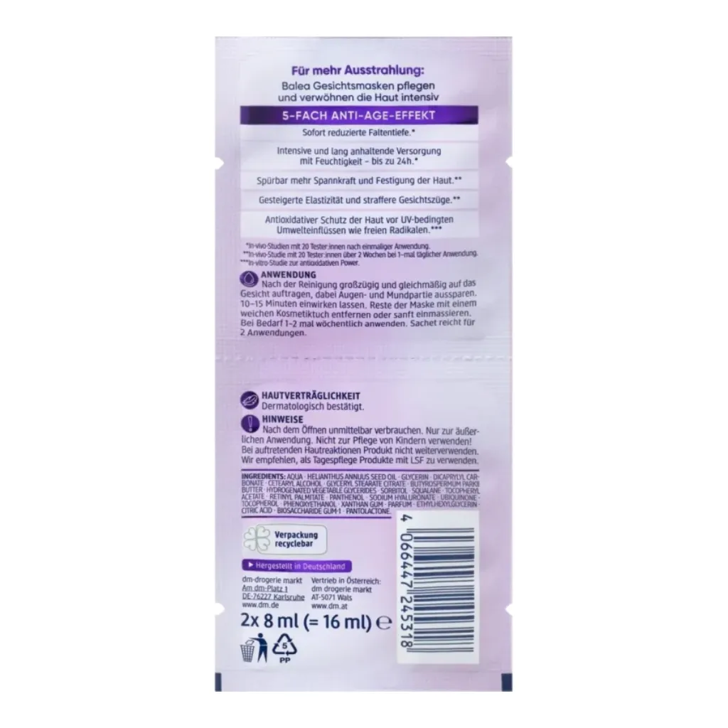 The Balea Retinol Face Mask with an active ingredient complex of retinol, vegetable squalane and vitamin E has a 5-fold effect against the signs of skin aging. You will immediately notice a reduction in the depth of wrinkles and benefit from an intensive and long-lasting supply of moisture for up to 24 hours The results are noticeably more elasticity and firming of the skin as well as increased elasticity and firmer facial features. The face mask also offers antioxidant protection for the skin against UV-related environmental influences such as free radicals.