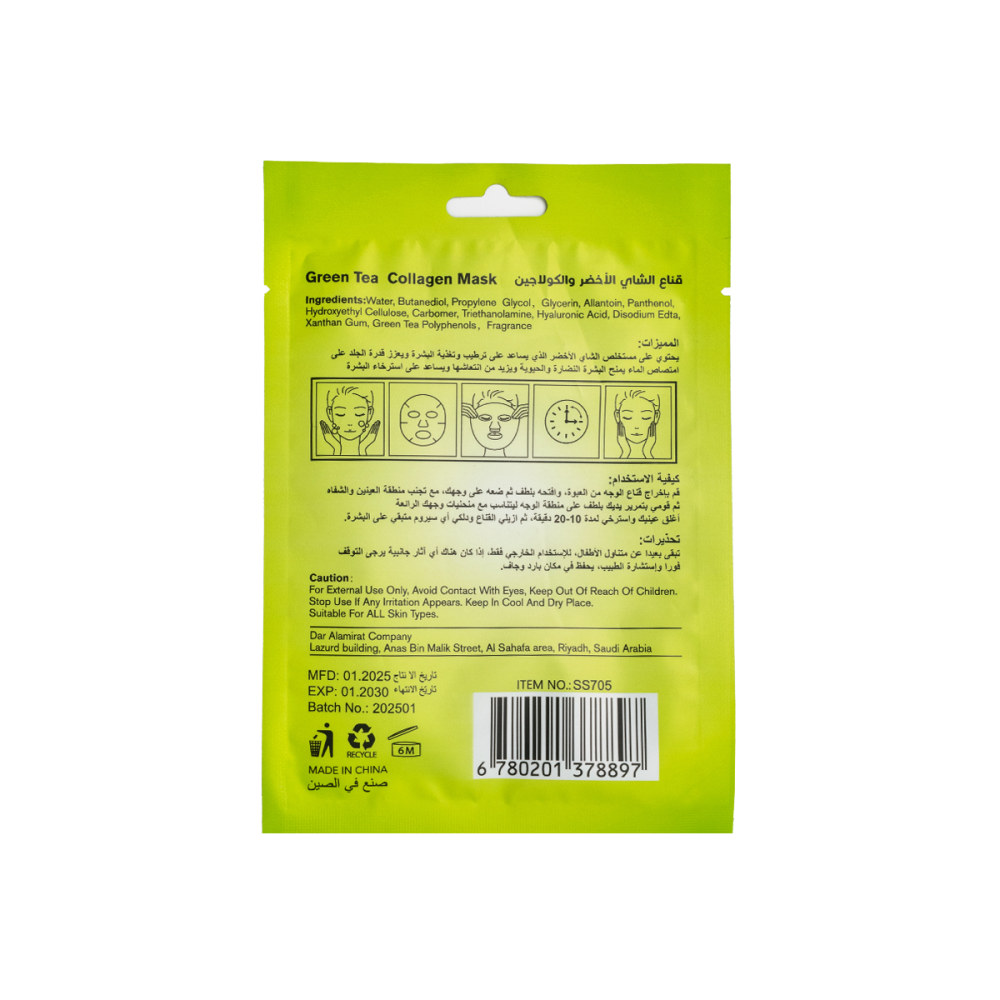 Revitalize your skin with the Spa System Green Tea Collagen Facial Mask, enriched with the natural power of green tea and collagen. This ultra-soothing 28ml sheet mask detoxifies, tones, and deeply hydrates your skin, leaving it fresh, firm, and radiant. Ideal for daily skincare or a relaxing self-care ritual!
