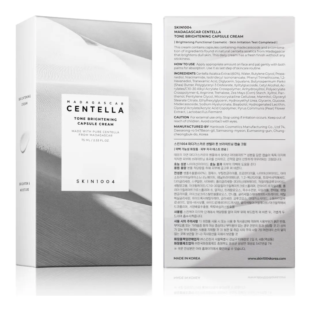 SKIN1004 Madagascar Centella Tone Brightening Capsule Cream is designed to provide a brighter and more even complexion. With a high concentration of patented Made white ingredients, this product offers an effective approach to skin brightening, packed within small capsules. Formulated with Niacinamide and Tranexamic Acid, this cream works to reduce the appearance of dark spots, creating a more even skin tone. Its nourishing capsules also help to strengthen the skin barrier.